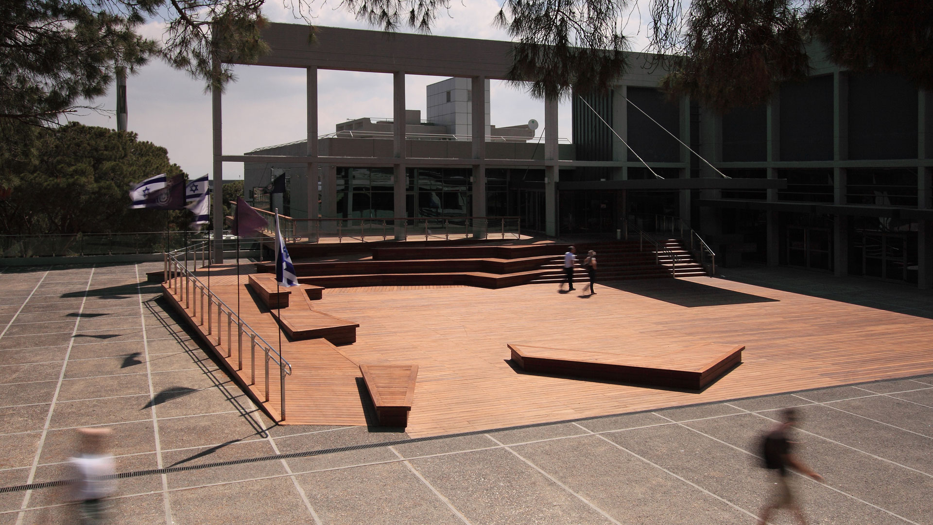 רחבת הכניסה לבית הסטודנט החדש, הממוקמת על אחד הצירים המרכזיים בקמפוס, נועדה לתת מענה להתכנסויות סטודנטים. רמפת הנכים שנדרשה בכניסה למבנה נבחרה להוות את האלמנט העיצובי המרכזי סביבו התפתח התכנון כולו; במקום להצניעה בקרן זווית היא הפכה לעמוד השדרה של חלל המפגש הציבורי היומיומי ברחבה. טריבונת הישיבה, המשמשת כמקום מפגש, נשענת על הרמפה ויוצרת מעיין אמפיתיאטרון כלפי הרחבה למופעים וריקודי עם. בכל האלמנטים המרכיבים את הרחבה נעשה שימוש בעץ, אשר הופך את הרחבה לאלמנט פיסולי אחד שלם.